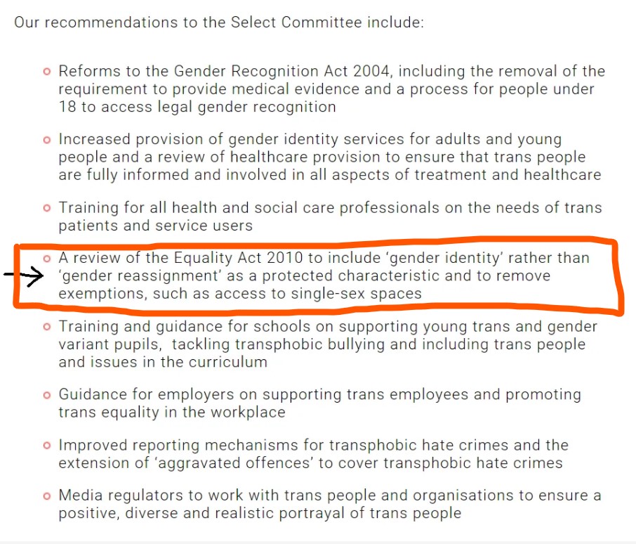 “A review of the Equality Act 2010 to include ‘gender identity’ rather than ‘gender reassignment’ as a protected characteristic and to remove exemptions, such as access to single-sex spaces”